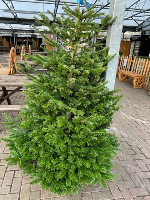 Slim Nordman Fir, low needle drop Christmas tree. This grade of tree has been pruned three times whilst growing to provide a thinner tree for smaller rooms. The tree is not as wide as normal Nordman trees.