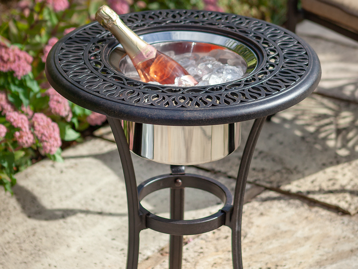 Combining an elegant stylised design with classic curves and a solid, smooth finish the Amalfi ice bucket table is a great choice for entertaining. A celebration table if ever there was one, the ice bucket is removable so you can use the table as a bistro or a side table. A truly fabulous addition to your garden and your Amalfi furniture.