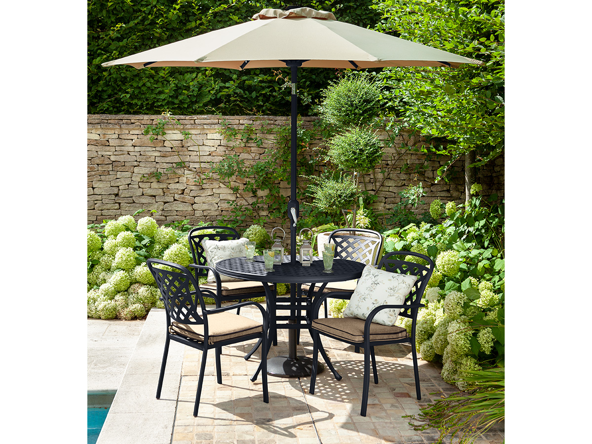Alfresco dining couldn’t be more simple yet stylish with the smooth contemporary lattice of the Berkeley range. Crafted from cast aluminium this furniture is durable, attractive and has great strength and value at its heart. The table and chairs can be left in the garden looking beautiful all year long, whilst our permeable Weatherready® cushions can be left outside in summer months – allowing you to make the most of the season. This set comes with a 2.5m Round Parasol and 15kg base and coordinates beautifully with other dining and lounging options in the Berkeley collection and will bring your garden happy times for years to come.