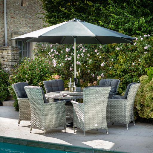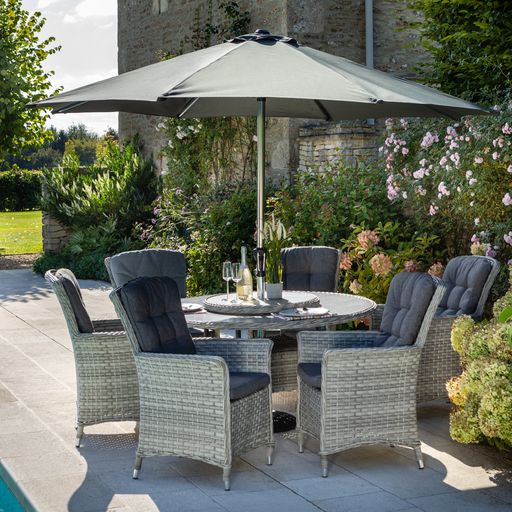 Entertaining your family and friends with the Heritage six seat round dining set will create perfect alfresco memories. Our large, elegant round table is crafted from resin weave, hand woven over a light but strong aluminium frame and finished with a tempered glass top . This same craftsmanship is applied to the included Lazy Susan – adding function and fun to your dining. Six generous sized dining chairs provide extra comfort and support with their high backs and arm rests and come supplied with our comfortable Weatherready® cushions. These cushions can be left outside during summer months, whilst the table and chairs can happily live outside all year round. This set comes with a 3m Round Premium Parasol and 15kg base and coordinates beautifully with other dining and lounging options in the full Heritage collection.