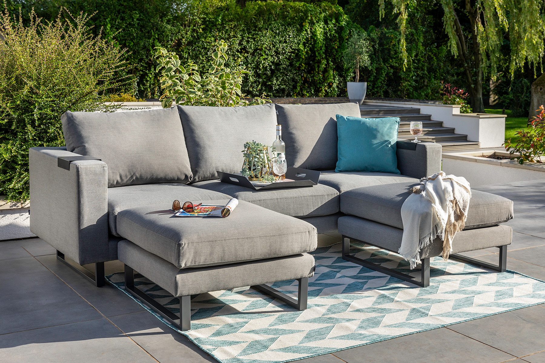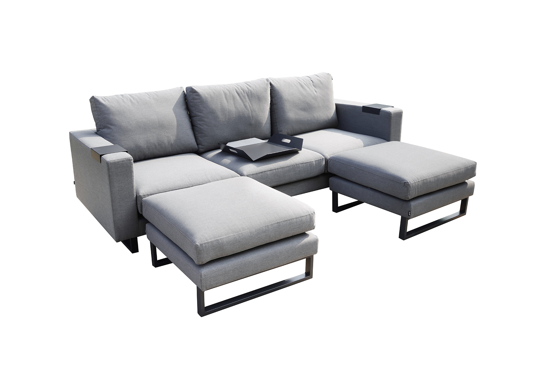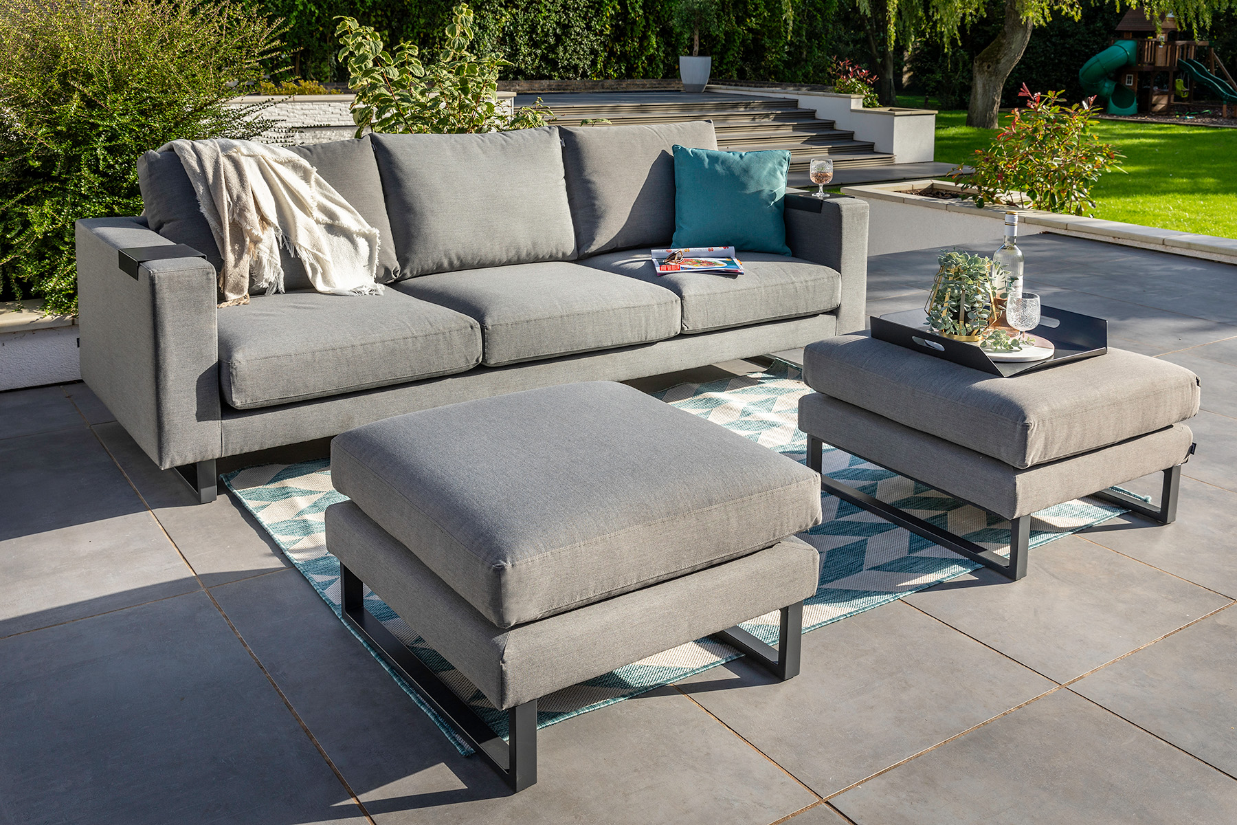 Encapsulating the desirable 5th room look, the Riviera range offers interior style for outdoor spaces. This versatile twin chaise set does not compromise on comfort, design or quality. The ZonTex® All-Weather Fabric is engineered to combine the highest level of design and performance, allowing for easy maintenance and withstanding years of normal exposure to sun and rain. The 3 seat sofa is complimented with two large Ottoman stools which can be placed to provide two ultra comfortable chaise-loungers or separate them up to provide extra seating for when guests arrive. The set is finished with a pair of convienient arm trays and an ottoman tray to rest your snacks and drinks. Pair this lounge set with one of the Riviera dining sets or futon loungers to complete the look.