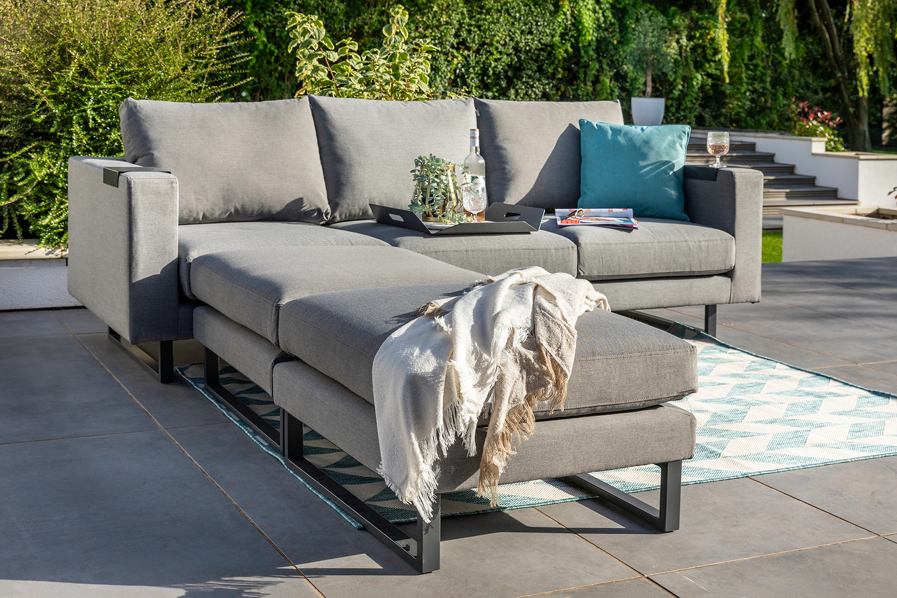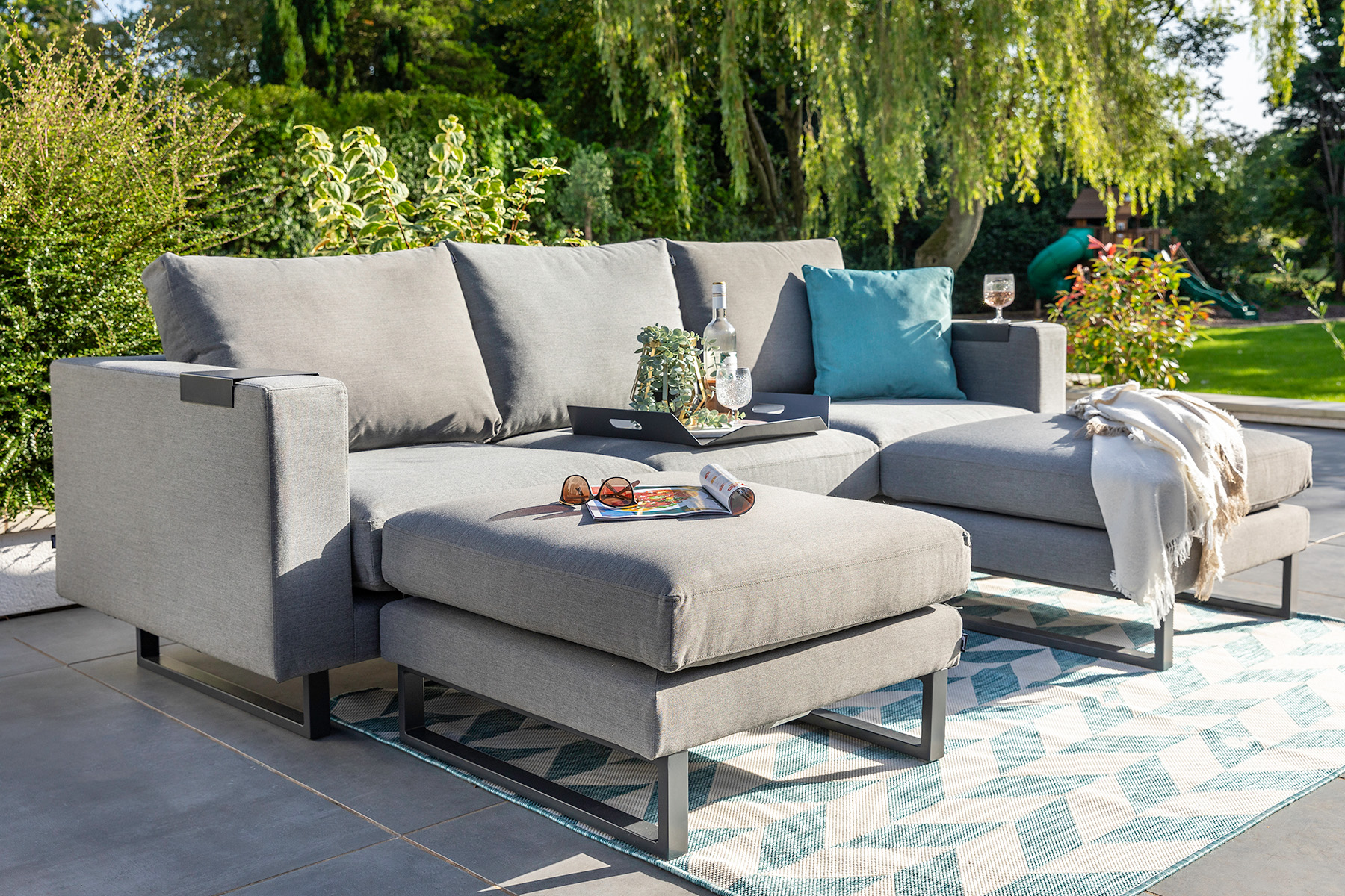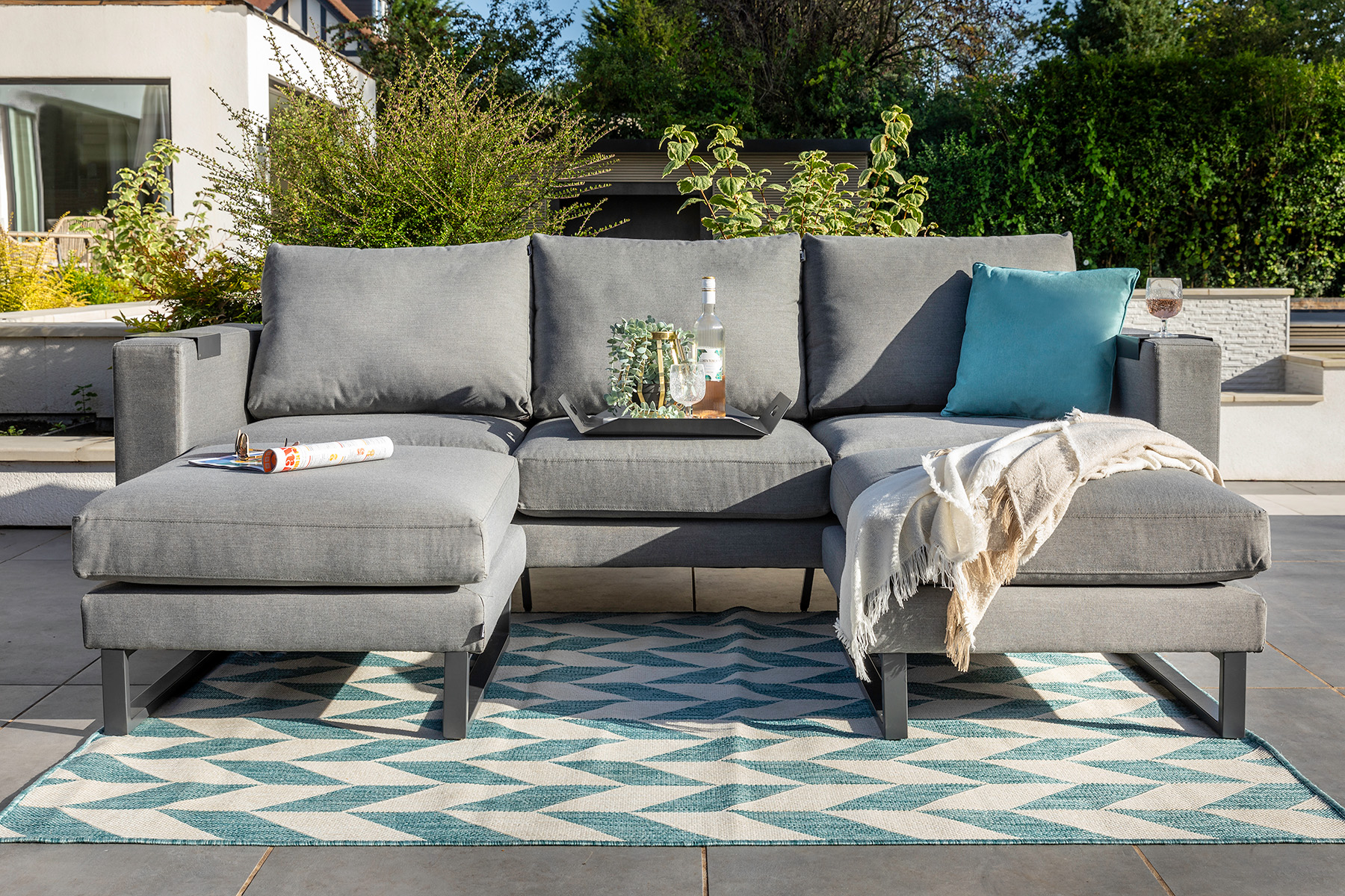 Encapsulating the desirable 5th room look, the Riviera range offers interior style for outdoor spaces. This versatile twin chaise set does not compromise on comfort, design or quality. The ZonTex® All-Weather Fabric is engineered to combine the highest level of design and performance, allowing for easy maintenance and withstanding years of normal exposure to sun and rain. The 3 seat sofa is complimented with two large Ottoman stools which can be placed to provide two ultra comfortable chaise-loungers or separate them up to provide extra seating for when guests arrive. The set is finished with a pair of convienient arm trays and an ottoman tray to rest your snacks and drinks. Pair this lounge set with one of the Riviera dining sets or futon loungers to complete the look.
