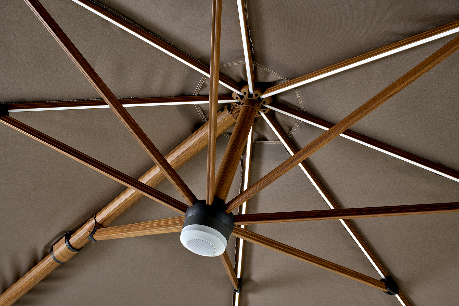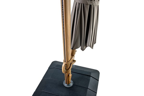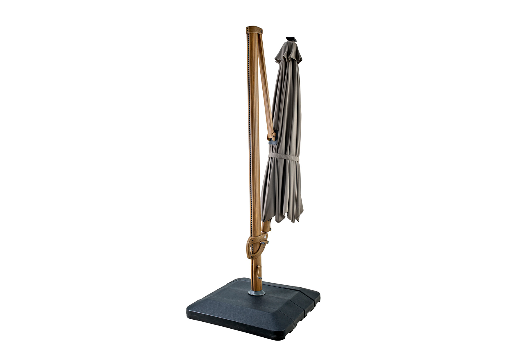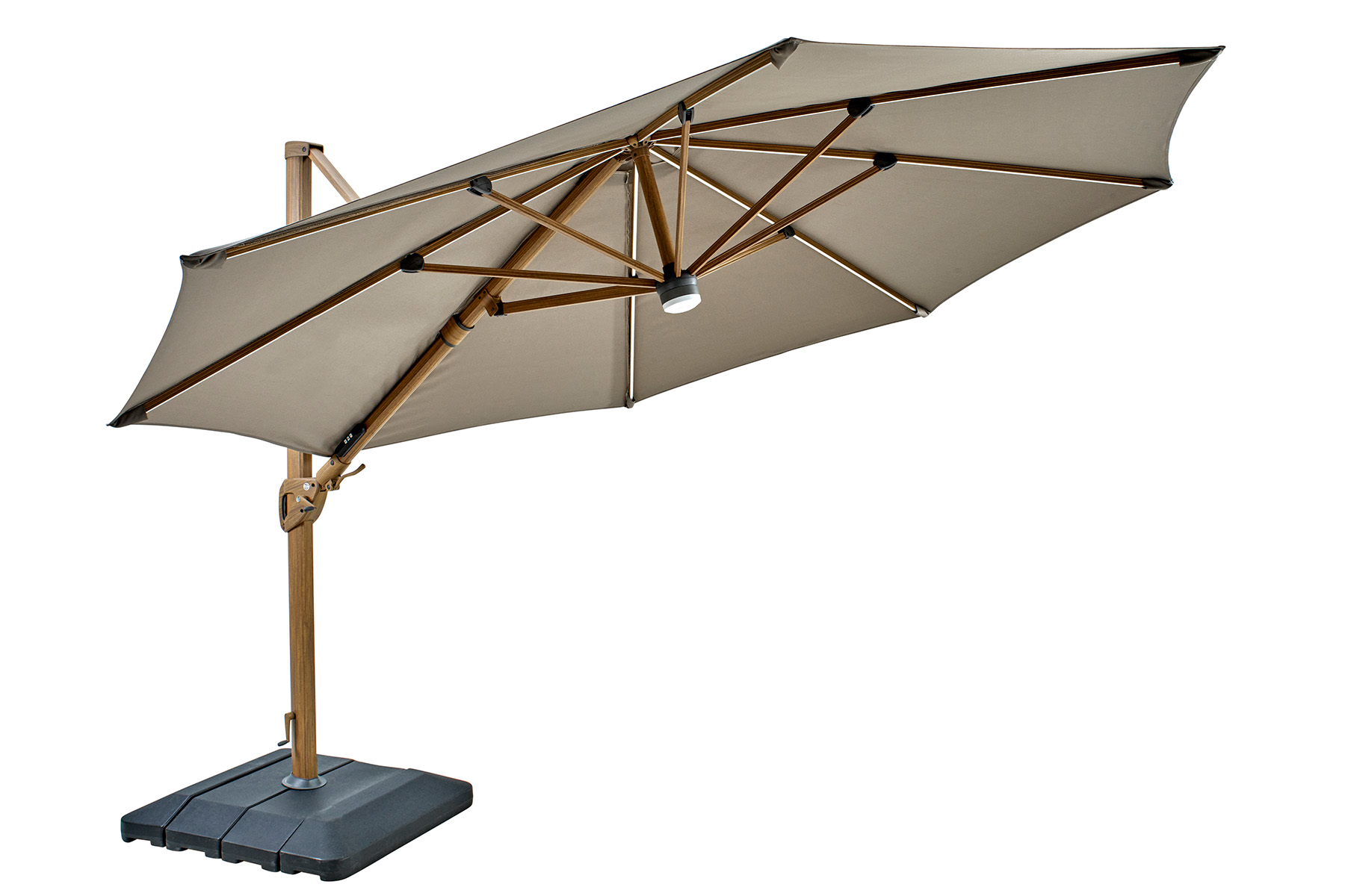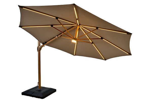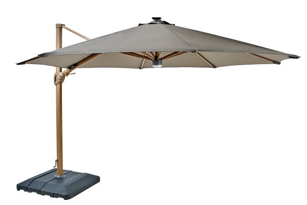 Impress your friends and family with the ultimate in garden accessories. The Seychelles Cantilever can impress day and night, featuring solar powered LED lights to add a touch of glamour to your dinner parties and a bluetooth speaker to play your favourite music. The Seychelles Cantilever comes with an abundance of features; it’s shower resistant, hard wearing canopy is UPF50+ Certified, offering the ultimate protection from the sun. The lower crank handle offers 360 degrees rotation for continuous shade as the sun moves throughout the day. The stunning Folie pole gives you the look of wood, without the annual maintenance to keep a golden hue. This impressive cantilever parasol also comes with a base included.