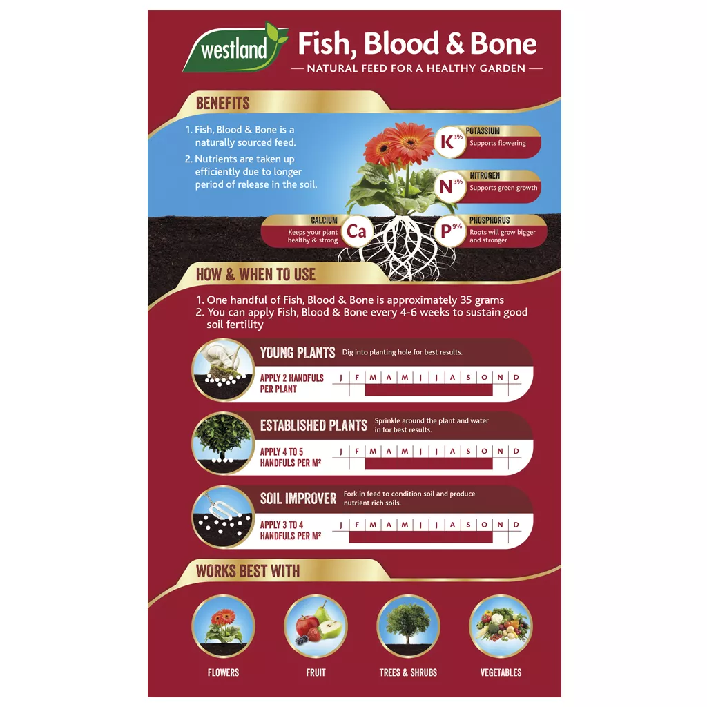 Westland  Fish, Blood and Bone is a good natural source of all three of the major nutrients. Nutrients are taken up efficiently due to longer period of release in the soil. Being especially high in phosphorus makes it particularly good for stimulating strong, healthy root growth.