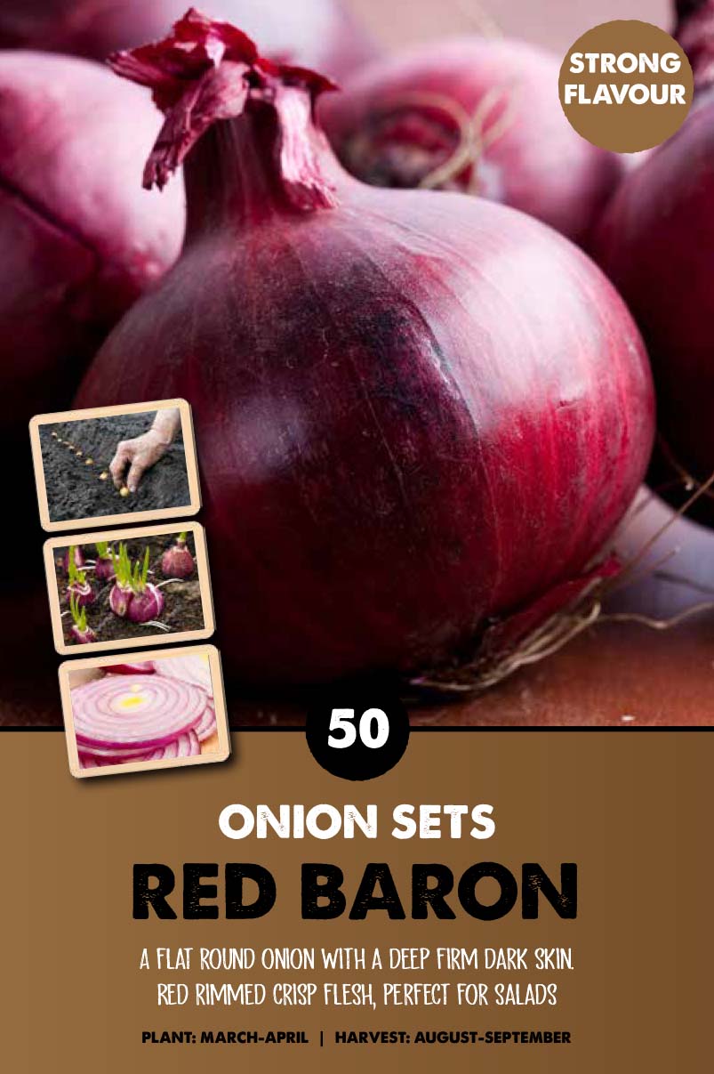| Superb results are guaranteed from growing this mid to late season variety that has good storage potential. Numerous thin necked, deep dark red skinned, flat round onions which have a firm, red-rimmed crisp flesh giving a strong flavour. Perfect for salad use. |