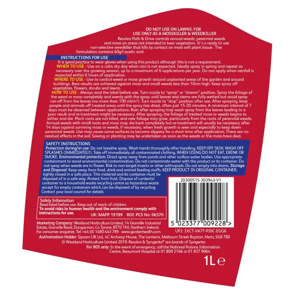 Resolva Path & Drive Ready to Use is a fast acting non-glyphosate formulation to effectively control both weed and moss. It is perfect for eliminating deep-rooted weeds on paths, patios, gravel and driveways. Furthermore, because this formula does not contain glyphosate, it is bee friendly. Additionally use this weedkiller all year round, so its never too late to tackle your weed problems.