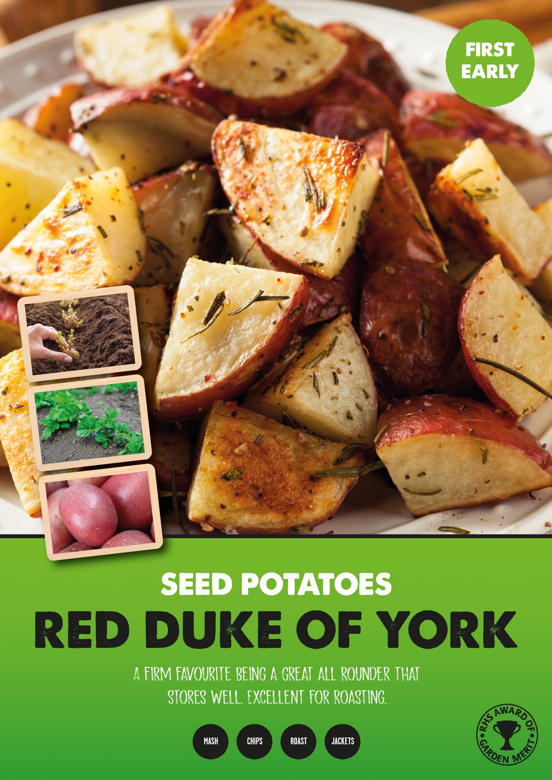 | A sport of ‘Duke of York’ having more vigorous growth and producing larger red skinned oval tubers with light-yellow, floury flesh that give a splendid strong flavour. A firm favourite ‘Heritage Potato’ that stores well. Excellent for roasting but a great all rounder. |