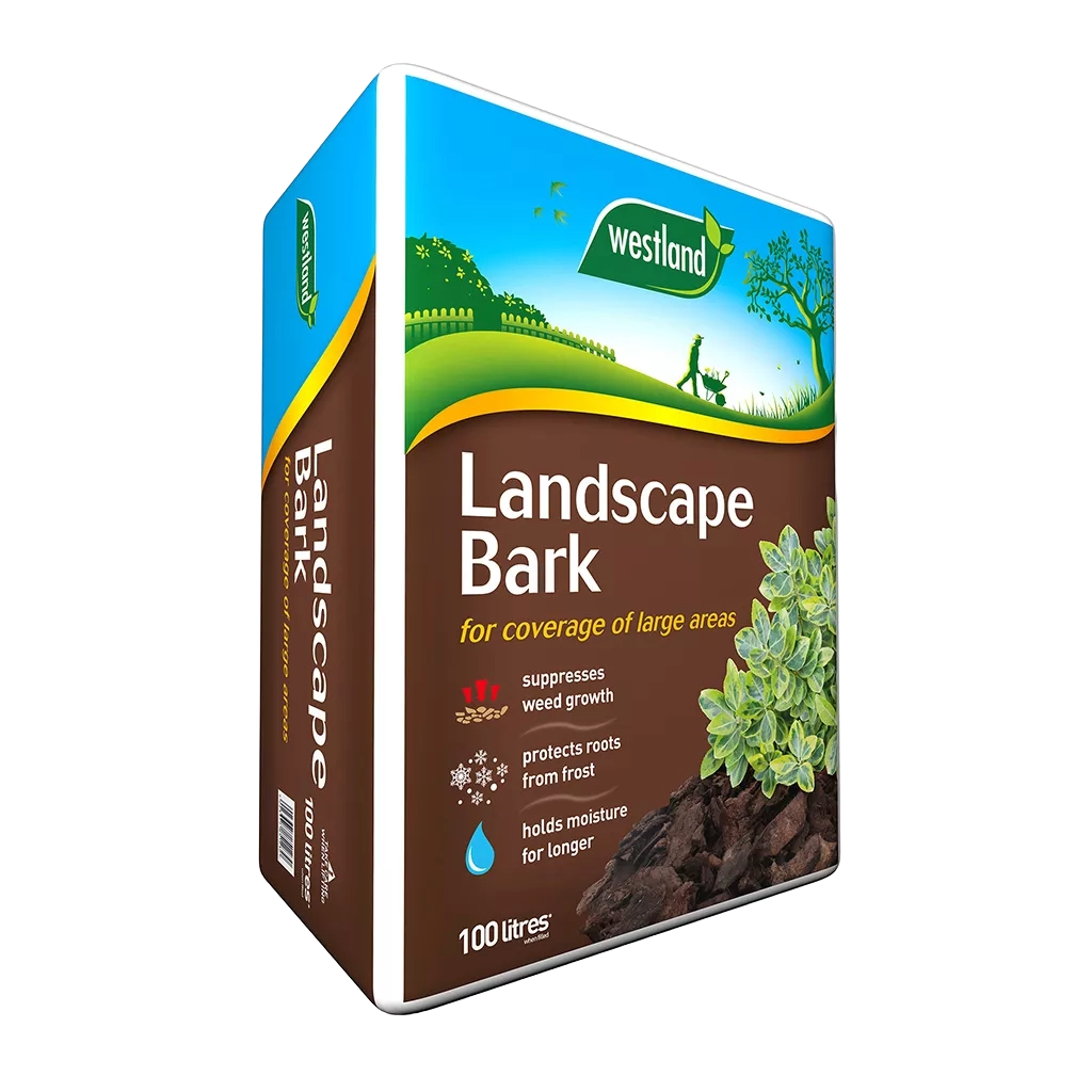Westland Landscape Bark is a specially selected grade of screened large bark chips (**approximately 30-50mm – size can vary) that can be used on flower beds and borders, trees and fruit bushes. It is an exceptional decorative ground cover mulch providing excellent weed suppression, moisture retention and thermal protection for plant roots.