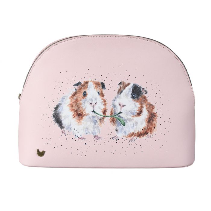 This beautiful large cosmetic bag featuring the ‘Lettuce be Friends’ guinea pig design is a great addition to anyone’s Wrendale collection. With lots of space for make-up and all the essentials, a sturdy base, branded zip top fastening, antique brass wren stud and contrasting coloured interior this bag feels extra special and is a pleasure to use. 245mm x 330mm x 100mm. Made from textured vegan leather.