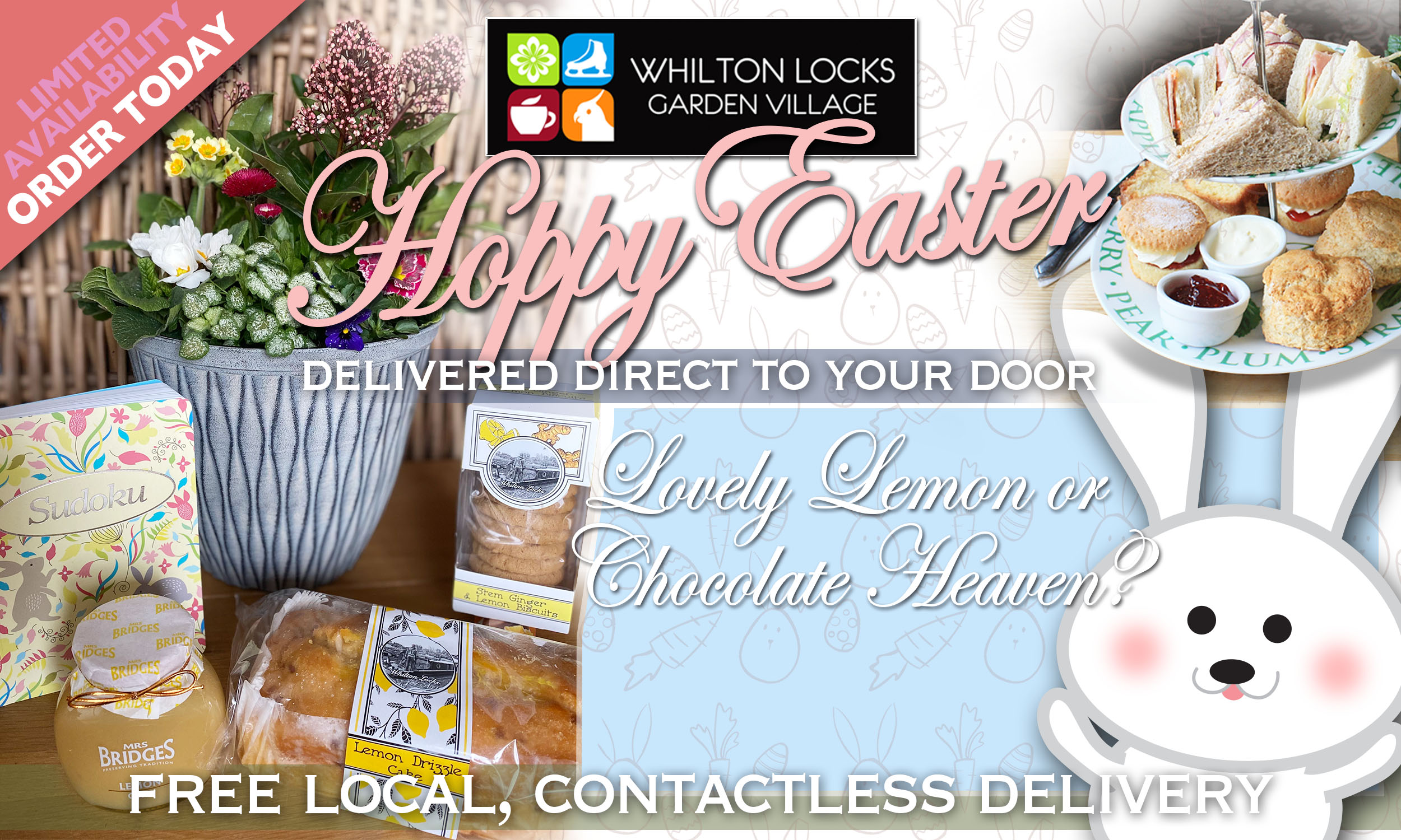 Introducing the Whilton Locks Garden Village delightful Easter gift pack – and we’ll deliver it locally for FREE** – contactlessly – straight to your door – or to your family or friends. You can choose between Lovely Lemon or Chocolate Heaven and two price points; with our deluxe offer including an Afternoon Tea for two, er… too!